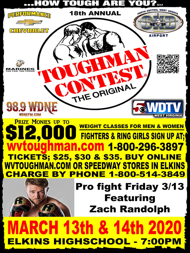 Posted by January 8, 2026 « All Events This event has passed. 18th Annual Toughman Contest @ Elkins High School March 13, 2020 @ 7:00 pm - 9:00 pm|Recurring Event (See all)One event on March 14, 2020 at 7:00 pm « “Dancing Joy” Film Screening @ Davis & Elkins College The Soundmen @ El Gran Sabor » Add to calendar Google Calendar iCalendar Outlook 365 Outlook Live Details Date: March 13, 2020 Time: 7:00 pm - 9:00 pm Event Tags:Competition, Entertainment Website: https://www.facebook.com/events/2663251443917676/ Venue Elkins High School, 100 Kennedy Dr, Elkins, WV 26241, USA 13 Kennedy Dr United States + Google Map Related Events Quilting 101 Class @ Elkins Sewing Center January 10 @ 10:00 am - 1:00 pm Quilting 101 Class @ Elkins Sewing Center January 13 @ 10:00 am - 1:00 pm