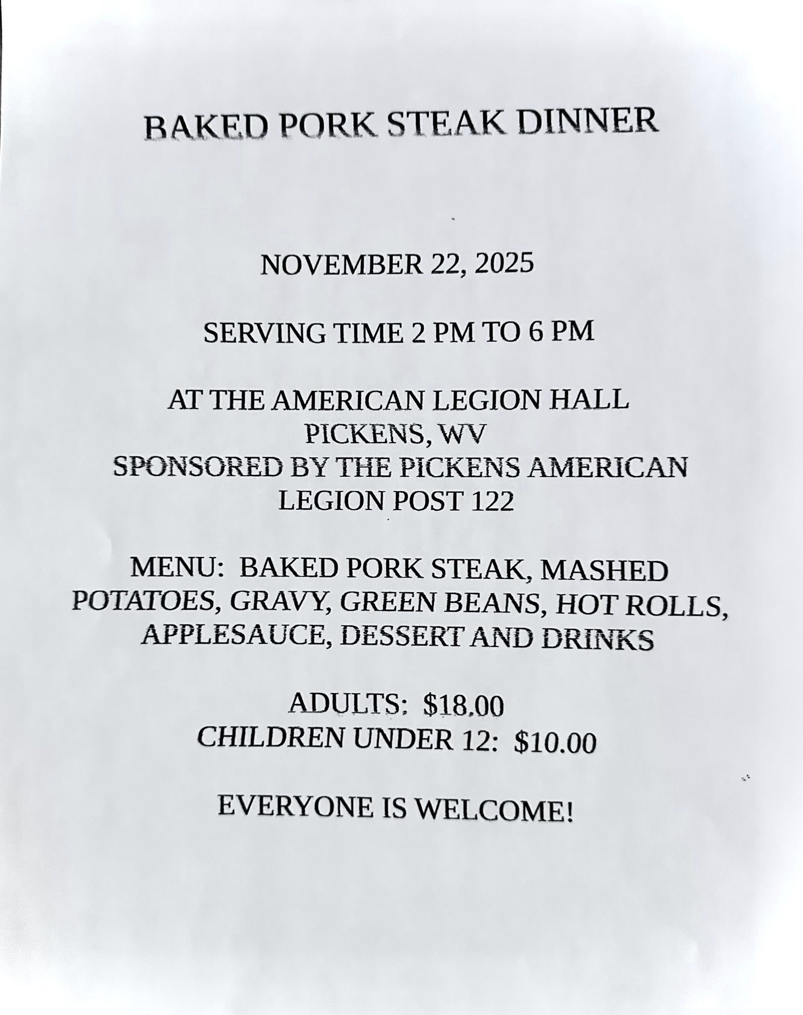 The Pickens American Legion Post 122 will host a baked pork steak dinner 2 to 6 p.m. Nov. 22 at the American Legion Hall. The menu will include baked pork steak, mashed potatoes, gravy, green beans, hot rolls, applesauce, dessert and drinks.