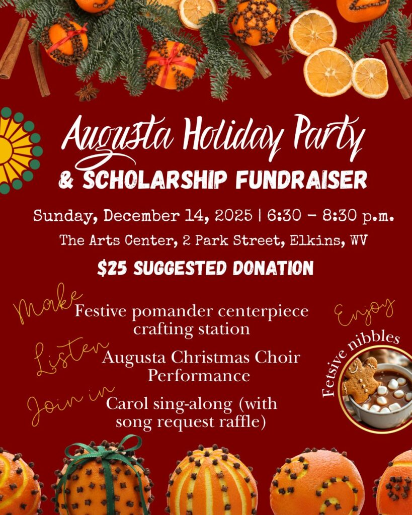 Posted by December 10, 2025 « All Events Augusta Holiday Party & Scholarship Fundraiser December 14 @ 6:30 pm - 8:30 pm « Gandy Dancer Mountain Memories Christmas Holiday Piano Music with Raymond Godwin » Augusta Christmas Choir Performance $25 Suggested Donation Add to calendar Google Calendar iCalendar Outlook 365 Outlook Live Details Date: December 14 Time: 6:30 pm - 8:30 pm Event Categories: Community, Music Website: https://www.facebook.com/events/2231186687376882 Organizer Augusta Heritage Center Phone 3046371209 View Organizer Website Venue The Arts Center, aka Randolph Co. Community Arts Council 2 Park St Elkins, WV 26241 United States + Google Map Phone 304-637-2355 View Venue Website
