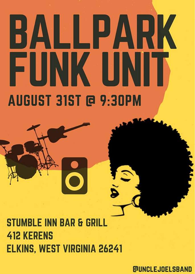 Posted by April 23, 2026 « All Events This event has passed. Ballpark Funk Unit @ Stumble In August 31, 2019 @ 9:30 pm - 11:30 pm « Eddie Davisson Band @ Smoke on the Water Elkins Depot- Cheat Mountain Salamander » Add to calendar Google Calendar iCalendar Outlook 365 Outlook Live Details Date: August 31, 2019 Time: 9:30 pm - 11:30 pm Event Category: Entertainment Event Tags:Entertainment, Live Music Website: https://www.facebook.com/events/445219086328255/ Venue Stumble In Bar n Grill, 412 Kerens Avenue, Elkins, WV, 26241, United States 901 S Kerens Ave United States + Google Map Related Events “Tygart Together” Block Party | Tygart Hotel April 24 @ 5:00 pm - 11:00 pm Brunch & Bubbles | Graceland Inn & Restaurant April 26 @ 11:00 am - 2:30 pm|Recurring Event (See all)An event every week that begins at 11:00 am on Sunday, repeating until April 26, 2026 Karaoke | Jimbo’s Place April 29 @ 8:30 pm - 10:30 pm|Recurring Event (See all)An event every week that begins at 8:30 pm on Wednesday, repeating indefinitely