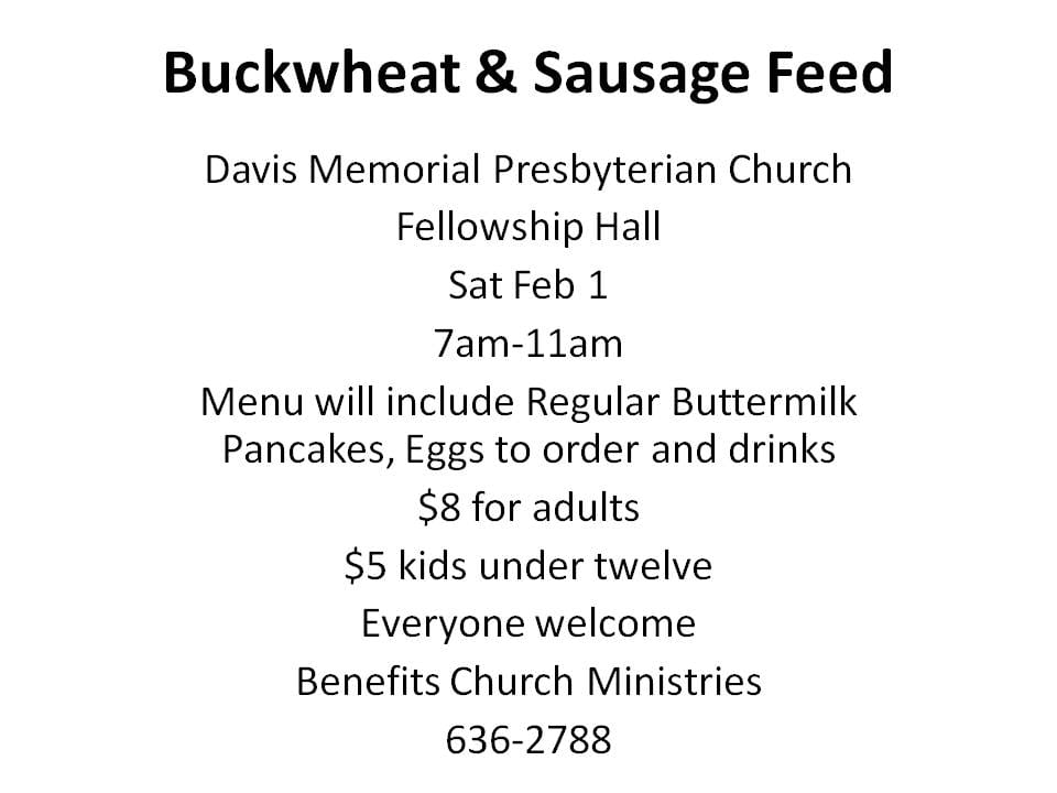 Posted by January 12, 2026 « All Events This event has passed. Buckwheat and Sausage Feed @ Davis Memorial Presbyterian Church February 1, 2020 @ 7:00 am - 11:00 am « Crosstown Traffic @ El Gran Sabor Heart Cup Class(prepay) @ Ceramics with Class » Add to calendar Google Calendar iCalendar Outlook 365 Outlook Live Details Date: February 1, 2020 Time: 7:00 am - 11:00 am Event Tags:Food Specials Venue Davis Memorial Presbyterian Church 450 Randolph Ave Elkins, WV 26241 United States + Google Map Phone 304-636-2788 View Venue Website