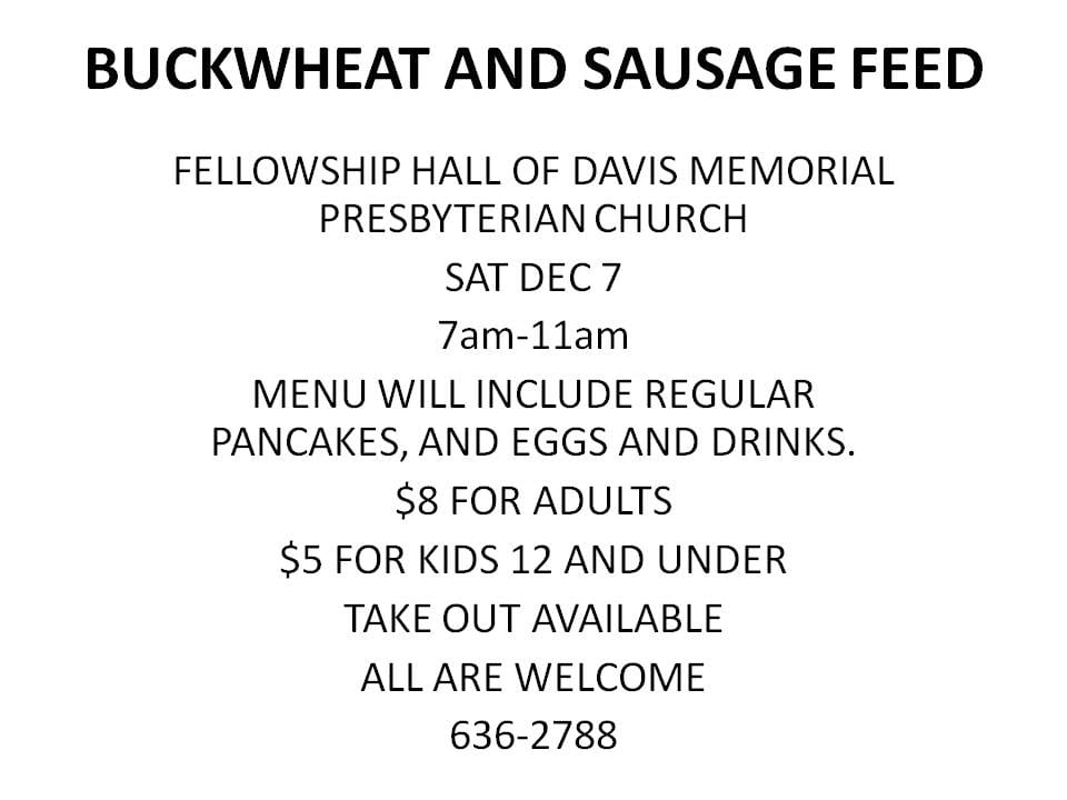 Posted by January 14, 2026 « All Events This event has passed. Buckwheat and Sausage Feed @ Davis Memorial Presbyterian Church December 7, 2019 @ 7:00 am - 11:00 am $10 « Prowess @ Stumble In Beverly Fire Department: Breakfast with Santa 2019 » Add to calendar Google Calendar iCalendar Outlook 365 Outlook Live Details Date: December 7, 2019 Time: 7:00 am - 11:00 am Cost: $10 Event Tags:Community, Food Specials Venue Davis Memorial Presbyterian Church 450 Randolph Ave Elkins, WV 26241 United States + Google Map Phone 304-636-2788 View Venue Website