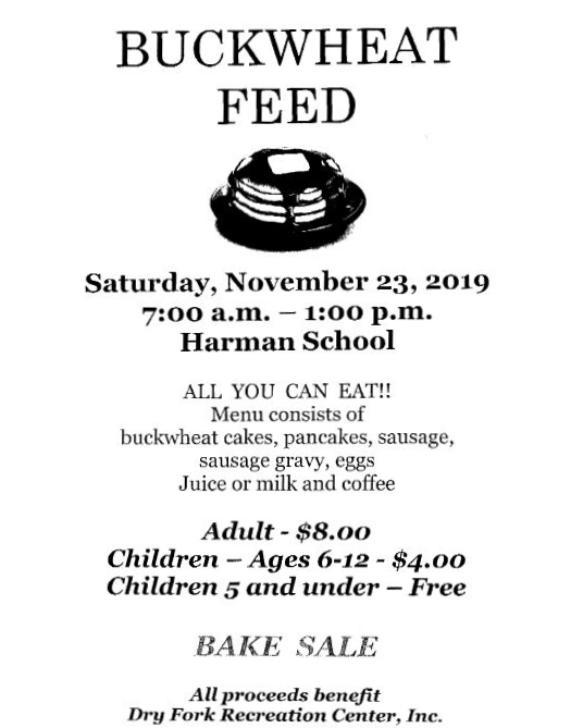 Posted by April 29, 2026 « All Events This event has passed. Buckwheat Feed @ Harman School November 23, 2019 @ 7:00 am - 1:00 pm $8 « Free Jukebox Night @ Shavers Saloon Christmas Bazaar @ Otterbein United Methodist Church » Add to calendar Google Calendar iCalendar Outlook 365 Outlook Live Details Date: November 23, 2019 Time: 7:00 am - 1:00 pm Cost: $8 Event Tags:Community, Food Specials Venue Harman, WV