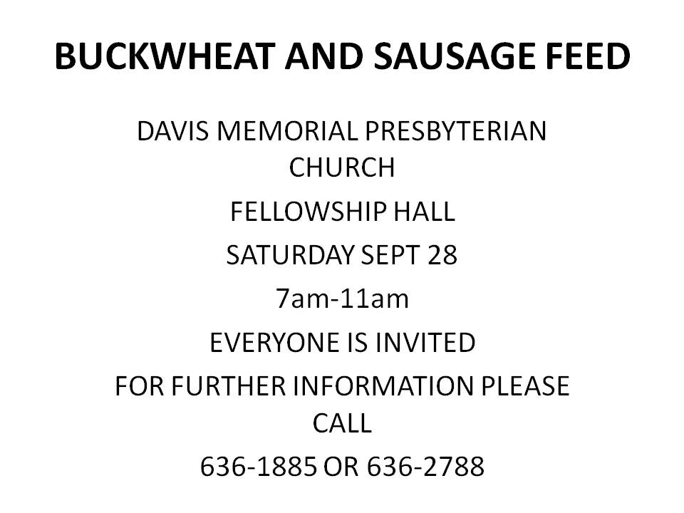 Posted by April 14, 2026 « All Events This event has passed. Buckwheat Pancake and Sausage Feed @ Davis Memorial Presbyterian Church September 28, 2019 @ 7:00 am - 11:00 am « Buckwheat Pancake Breakfast @ Beverly United Methodist Church Craft & Vendor Show @ Homestead School Community Center » Add to calendar Google Calendar iCalendar Outlook 365 Outlook Live Details Date: September 28, 2019 Time: 7:00 am - 11:00 am Event Tags:Community, Food Specials Venue Davis Memorial Presbyterian Church 450 Randolph Ave Elkins, WV 26241 United States + Google Map Phone 304-636-2788 View Venue Website