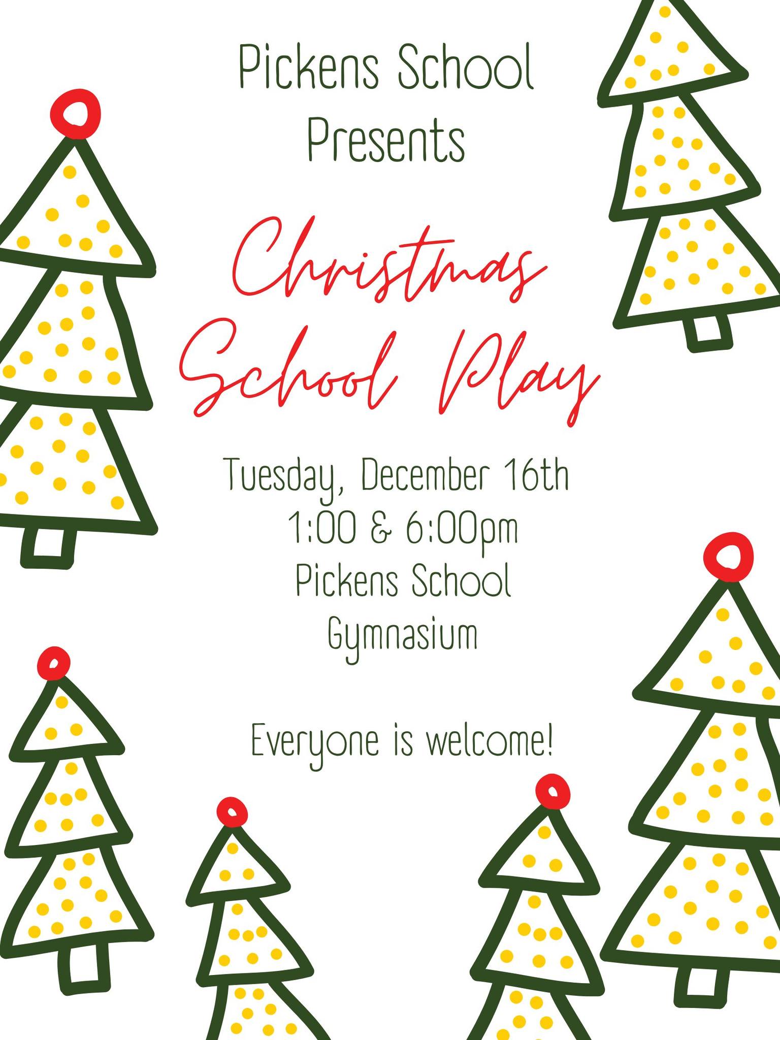 Mark your calendars for Tuesday, December 16th for our annual Christmas play. We will have two programs, at 1:00pm and 6:00pm, to accommodate all schedules. Please come join us for some Christmas cheer. The students are working so hard for their performances. Everyone is welcome!!