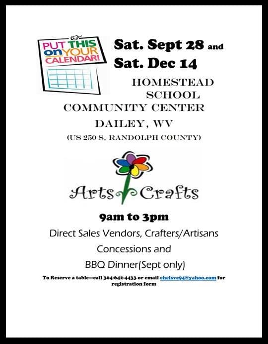 Posted by April 24, 2026 « All Events This event has passed. Craft & Vendor Show @ Homestead School Community Center September 28, 2019 @ 9:00 am - 5:00 pm « Buckwheat Pancake and Sausage Feed @ Davis Memorial Presbyterian Church MSFF Horseshoe Singles Competition @ Elkins City Park » Add to calendar Google Calendar iCalendar Outlook 365 Outlook Live Details Date: September 28, 2019 Time: 9:00 am - 5:00 pm Event Tags:Arts, Shopping Venue Homestead Community Center Dailey, WV United States + Google Map