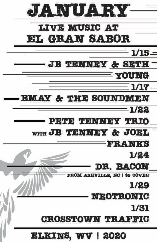 Posted by January 13, 2026 « All Events This event has passed. Crosstown Traffic @ El Gran Sabor January 31, 2020 @ 8:30 pm - 11:30 pm « Evening Winter Votive Candle Workshop @ The Arts Center Buckwheat and Sausage Feed @ Davis Memorial Presbyterian Church » Add to calendar Google Calendar iCalendar Outlook 365 Outlook Live Details Date: January 31, 2020 Time: 8:30 pm - 11:30 pm Event Tags:Live Music Website: https://elgransabor.com/shows-events/home-page-slider/crosstown-traffic/ Venue El Gran Sabor, 413 Kerens Ave, Elkins, WV 26241, USA 155 Kerens Ave United States + Google Map