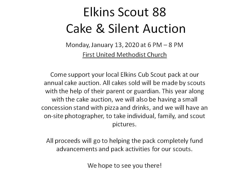 Posted by January 15, 2026 « All Events This event has passed. Elkins Scout 88 Cake & Silent Auction @ First United Methodist Church January 13, 2020 @ 6:00 pm - 8:00 pm « Wet Felting Workshop @ The Arts Center Elkins Scout 88 Cake & Silent Auction @ First United Methodist Church » Add to calendar Google Calendar iCalendar Outlook 365 Outlook Live Details Date: January 13, 2020 Time: 6:00 pm - 8:00 pm Event Tags:Benefit Event, Community, Food Specials Venue First United Methodist Church 315 Kerens Avenue Elkins, WV 26241 United States + Google Map Phone 304-636-0660 View Venue Website