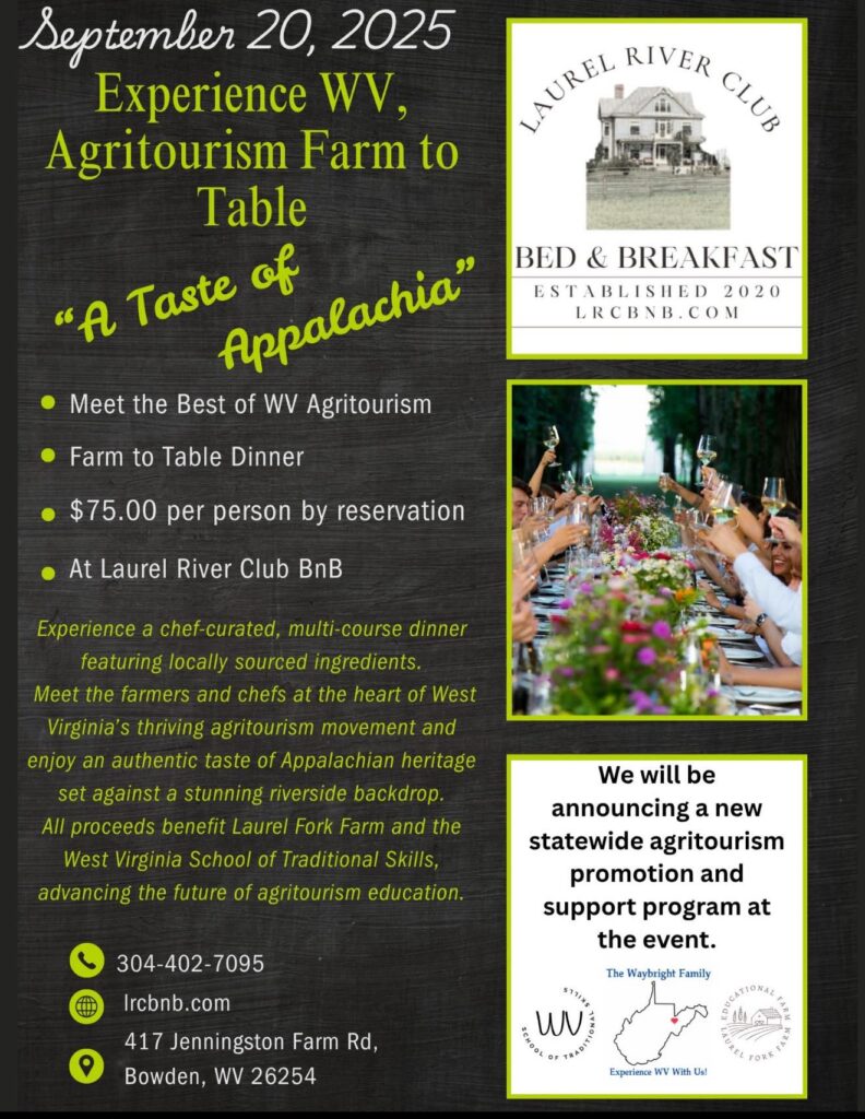 All proceeds benefit Laurel Fork Farm and the West Virginia School of Traditional Skills, advancing the future of agritourism education.