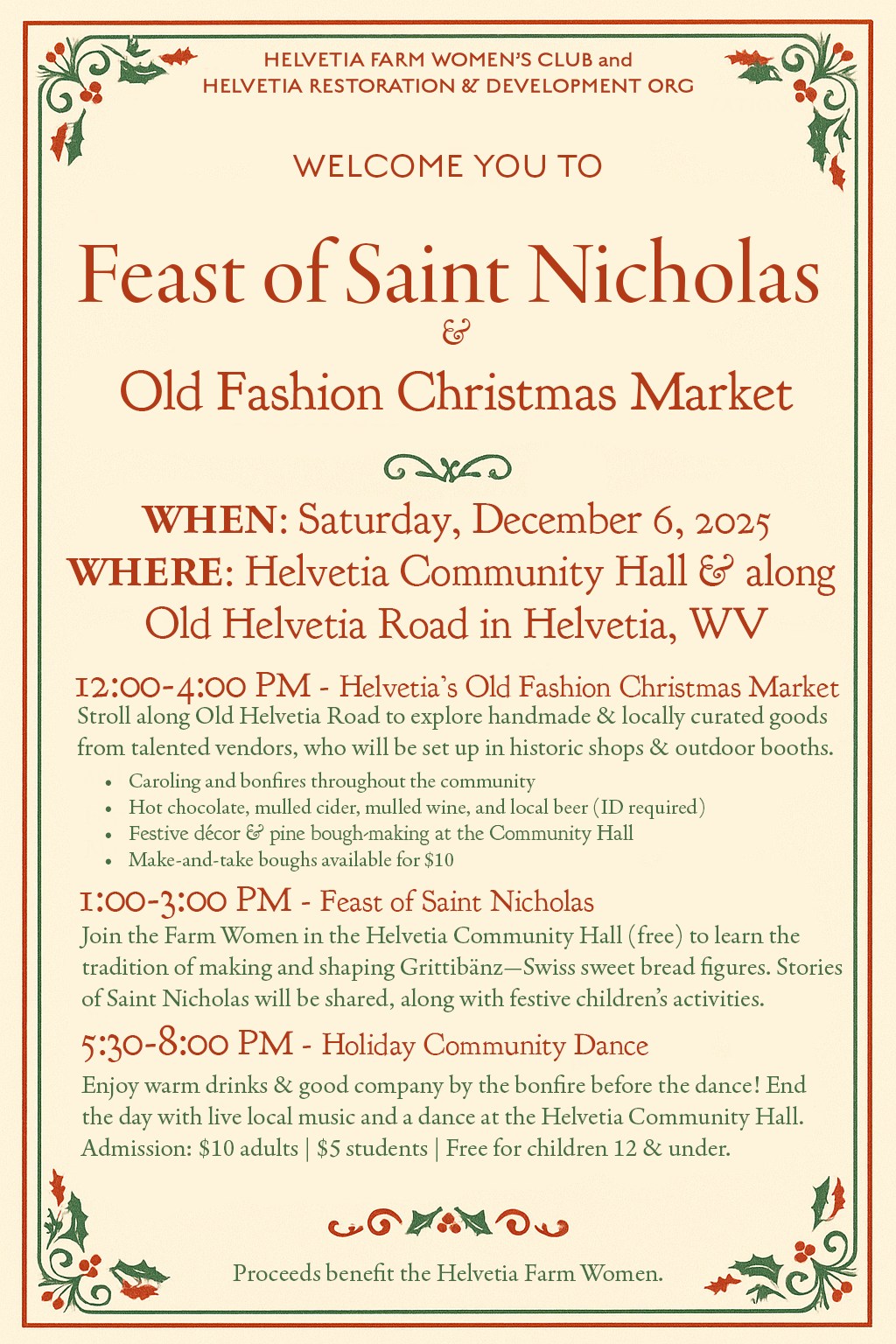 Join us in Helvetia on Saturday, December 6, for a day filled with old-world charm, handmade gifts, and community cheer. The Helvetia Farm Women’s Club and Helvetia Restoration & Development Organization invite you to celebrate with caroling, bonfires, mulled drinks, and a festive market along Old Helvetia Road.