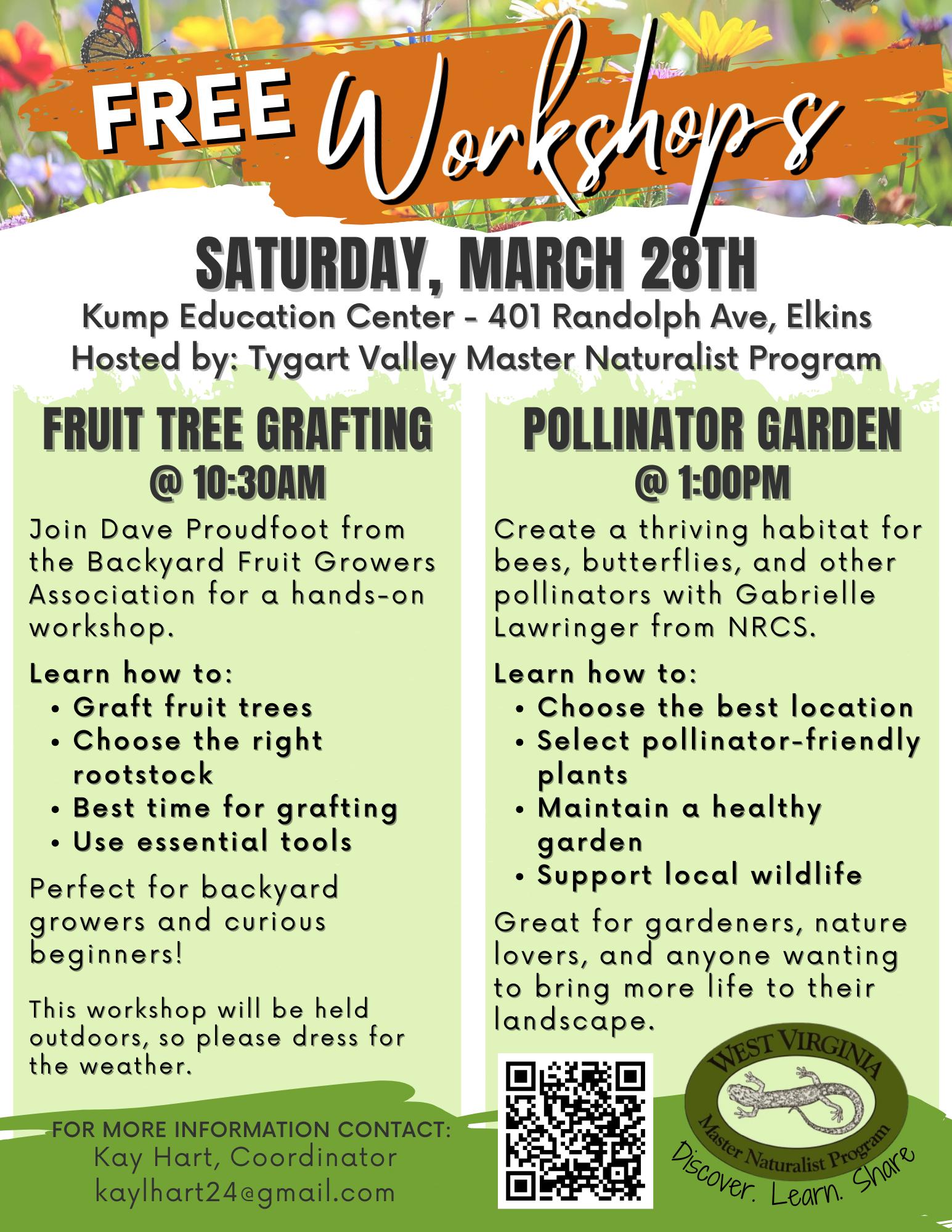 Posted by March 29, 2026 « All Events This event has passed. Fruit Tree Grafting Workshop @ Kump Education Center March 28 @ 10:30 am - 12:30 pm « Buckwheat Breakfast | Harman VFW Pollinator Garden Workshop @ Kump Education Center » Add to calendar Google Calendar iCalendar Outlook 365 Outlook Live Details Date: March 28 Time: 10:30 am - 12:30 pm Event Categories: Community, Educational Organizer WV Master Naturalist Tygart Valley Chapter Phone 304-642-6529 Email kaylhart24@gmail.com View Organizer Website Venue Kump Education Center 401 Davis Avenue Elkins, WV 26241 United States + Google Map View Venue Website Related Events Augusta Community Sing and Potluck March 30 @ 6:30 pm - 8:30 pm Tree Talks Lecture Series | Kump House April 1 @ 7:00 pm - 8:00 pm|Recurring Event (See all)One event on April 1, 2026 at 7:00 pmOne event on May 6, 2026 at 7:00 pm Cottontail Express | Durbin Greenbrier Railroad April 3 @ 11:00 am - April 4 @ 3:00 pm