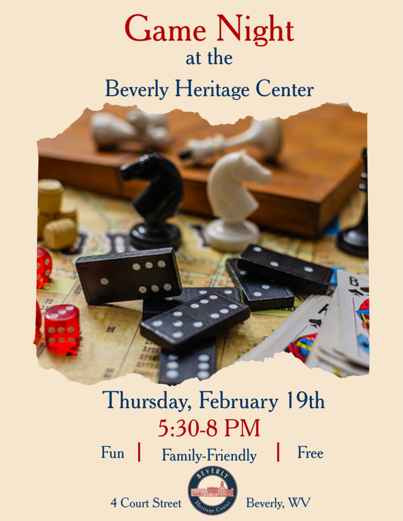 Posted by February 22, 2026 « All Events This event has passed. Game Night @ Beverly Heritage Center February 19 @ 5:30 pm - 8:00 pm « Wine Down Wednesday- Graceland Inn Chess Night | Fox Hops Brewery » Add to calendar Google Calendar iCalendar Outlook 365 Outlook Live Details Date: February 19 Time: 5:30 pm - 8:00 pm Event Categories: Competition, Entertainment Venue Beverly Heritage Center 4 Court Street Beverly, WV 26253 United States + Google Map Phone 3046377424 View Venue Website Related Events First Fridays | Downtown Elkins March 6 @ 5:00 pm - 8:00 pm|Recurring Event (See all)An event every month that begins at 5:00 pm on day First of the month, repeating until June 5, 2026 Rifle Rally | Phil Gainer Center March 7 @ 11:00 am - 6:00 pm Karaoke | Beander’s March 7 @ 8:00 pm - 11:00 pm|Recurring Event (See all)An event every month that begins at 8:00 pm on day First of the month, repeating until May 2, 2026
