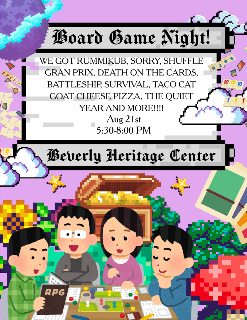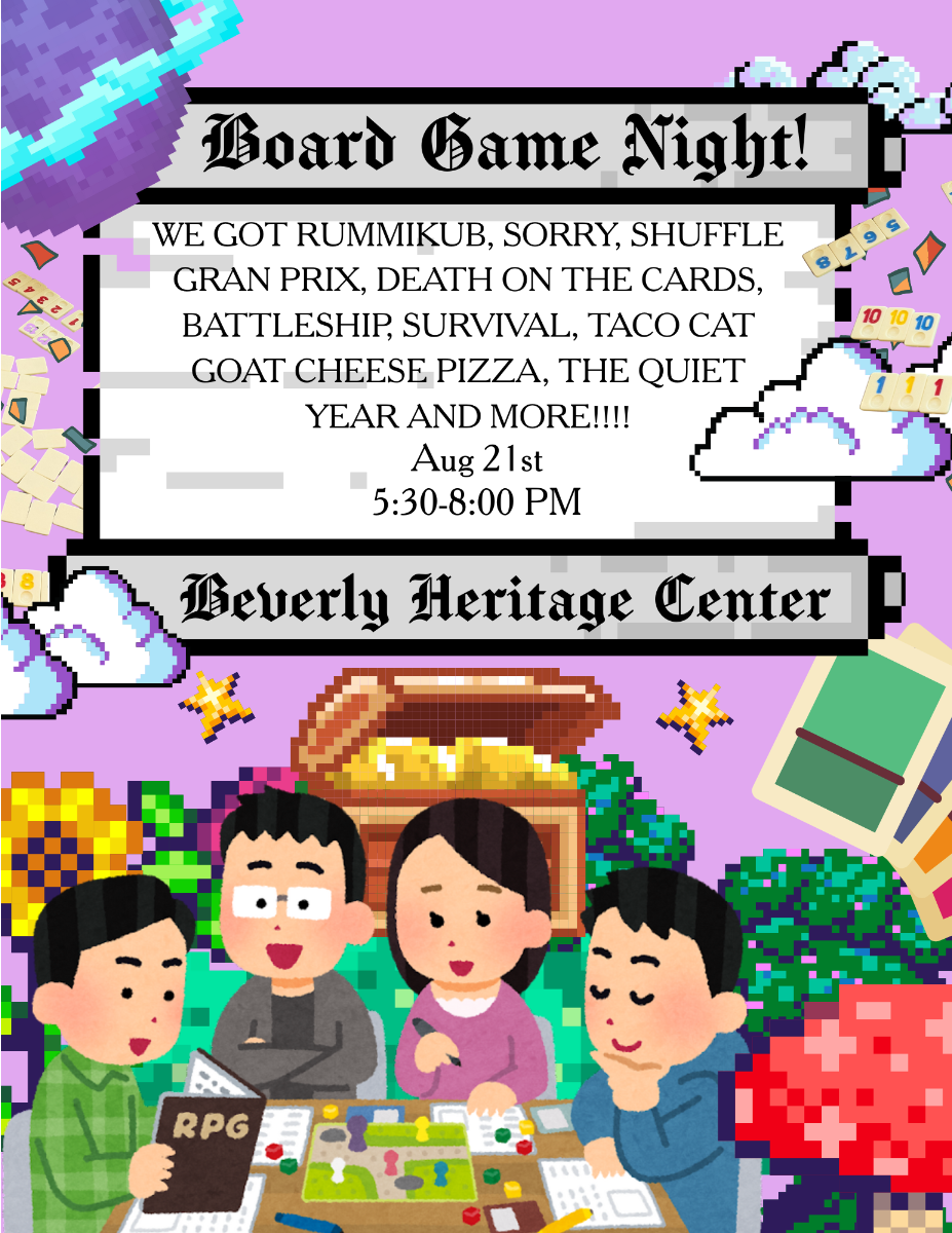 Come join us on Thursday, August 21st, from 5:30pm to 8pm for our monthly Game Night! We have a lot of games to choose from, but if you have a game (or three) that you’d like to share, we’d love to give it a try! Hope to see you there!