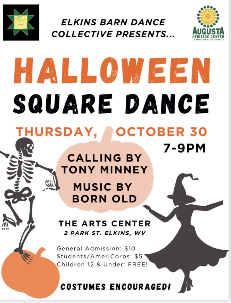 Posted by December 13, 2025 « All Events This event has passed. Halloween Square Dance | The Arts Center October 30 @ 7:00 pm - 9:00 pm « Scenic Train Excursion New Tygart Flyer Corn Maze & Pumpkin Patch | Snyder Farms » Add to calendar Google Calendar iCalendar Outlook 365 Outlook Live Details Date: October 30 Time: 7:00 pm - 9:00 pm Event Categories: Art & Culture, Entertainment Organizer Elkins Barn Dance Collective View Organizer Website Venue The Arts Center, aka Randolph Co. Community Arts Council 2 Park St Elkins, WV 26241 United States + Google Map Phone 304-637-2355 View Venue Website Related Events Eggnog from Scratch | Phil Gainer Community Center December 15 @ 6:00 pm - 8:00 pm Christmas Play | Pickens School December 16 Brown Bag Concert: Emily Miller & Jesse Milnes December 17 @ 12:00 pm - 1:00 pm