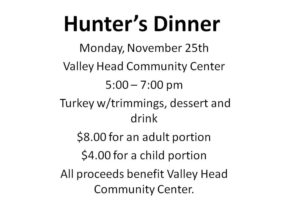 Posted by January 17, 2026 « All Events This event has passed. Hunter’s Dinner @ Valley Head Community Center November 25, 2019 @ 5:00 pm - 7:00 pm $8 « Burger Night @ Beanders Jackpot Bingo @ Beverly Fire Department » Add to calendar Google Calendar iCalendar Outlook 365 Outlook Live Details Date: November 25, 2019 Time: 5:00 pm - 7:00 pm Cost: $8 Event Tags:Community, Food Specials, fundraiser Website: https://www.facebook.com/events/799433933827770/ Venue Valley Head Community Center Route 219 S Valley Head, WV 26294 United States + Google Map Phone (304) 339-6047