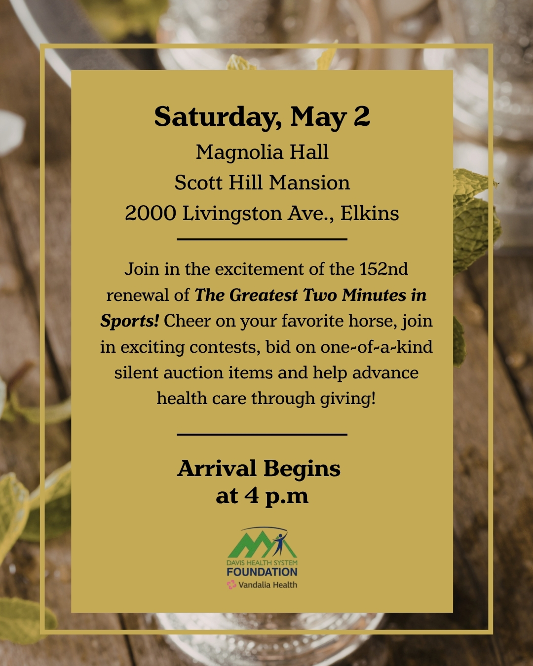 Get ready for an unforgettable evening filled with signature cocktails, live entertainment, exciting auctions and plenty of Southern charm all in support of the Davis Health System Foundation.