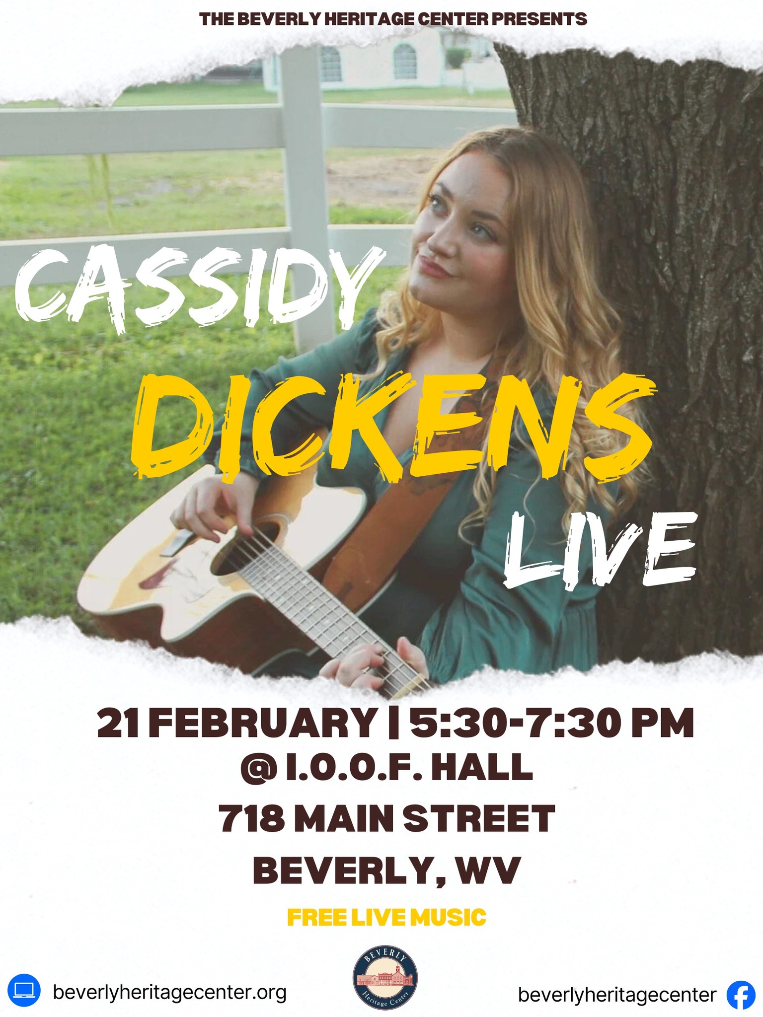 Our free community concert series is back! Join us for live music with local musician Cassidy Dickens. Fusing a powerful sense of traditional Appalachian storytelling with a modern folk sound, WV artist Cassidy Dickens brings a “unique fusion of vulnerability, resilience, unguarded sincerity, and soul-stirring melodies” to the world of acoustic Americana (HONK magazine). The indoor show will be at the Beverly IOOF Great Hall on Saturday, February 21 from 5:30-7:30 PM. We’ll see you there!