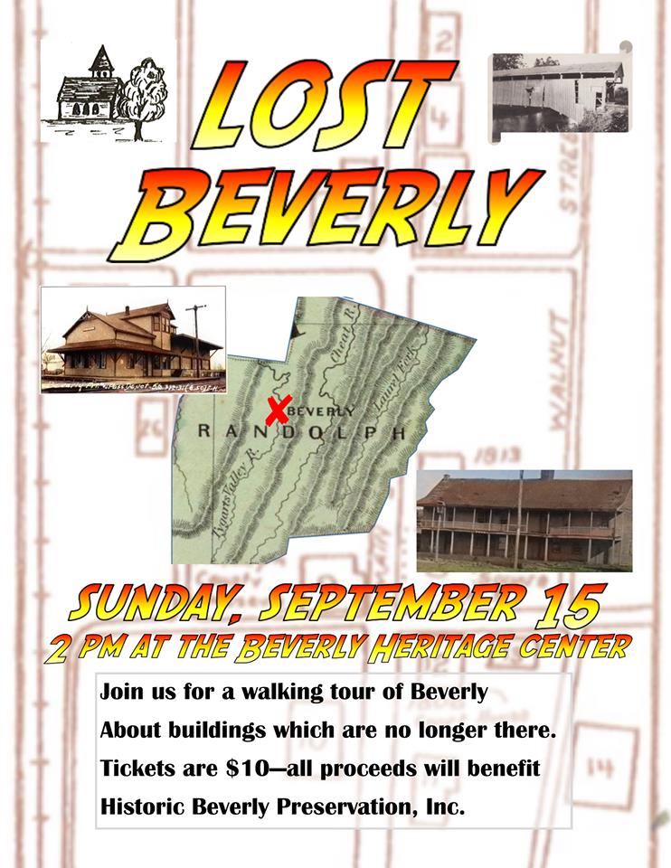 Posted by April 26, 2026 « All Events This event has passed. “Lost Beverly” Walking Tour @ Beverly Heritage Center September 15, 2019 @ 2:00 pm - 5:00 pm « Durbin Depot – Durbin Family Movie Night @ First United Methodist Church » Add to calendar Google Calendar iCalendar Outlook 365 Outlook Live Details Date: September 15, 2019 Time: 2:00 pm - 5:00 pm Event Category: Art & Culture Event Tags:Arts, Community, History, Kid Event, Kids & Family, Tours Venue Beverly Heritage Center 4 Court Street Beverly, WV 26253 United States + Google Map Phone 3046377424 View Venue Website Related Events The Arts Center Annual Gala May 15 @ 5:30 pm - 8:30 pm Open Mic | Brewstel May 15 @ 7:00 pm - 9:00 pm Helvetia Hoot May 29 - May 31