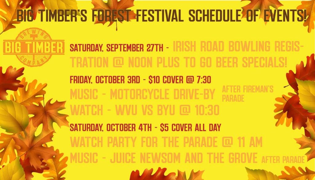 Posted by December 5, 2025 « All Events This event has passed. Parade Watch Party | Big Timber October 4 @ 11:00 am - 5:00 pm « Public Tours at The Kump House Antique and Classic Street Rod Car Parade » Add to calendar Google Calendar iCalendar Outlook 365 Outlook Live Details Date: October 4 Time: 11:00 am - 5:00 pm Event Categories: Food & Drink, Music Venue Big Timber Brewing 2 Davis Avenue Elkins, WV 26241 United States + Google Map Phone 304-637-5008 View Venue Website