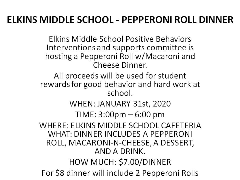 Each meal includes: a pepperoni roll, mac-n-cheese, dessert and a drink for $7. Purchase a meal with an extra pepperoni roll for $8. Meals not picked up by 5:45 PM will be resold. Proceeds will benefit the EMS positive behavior program.