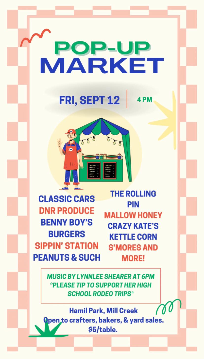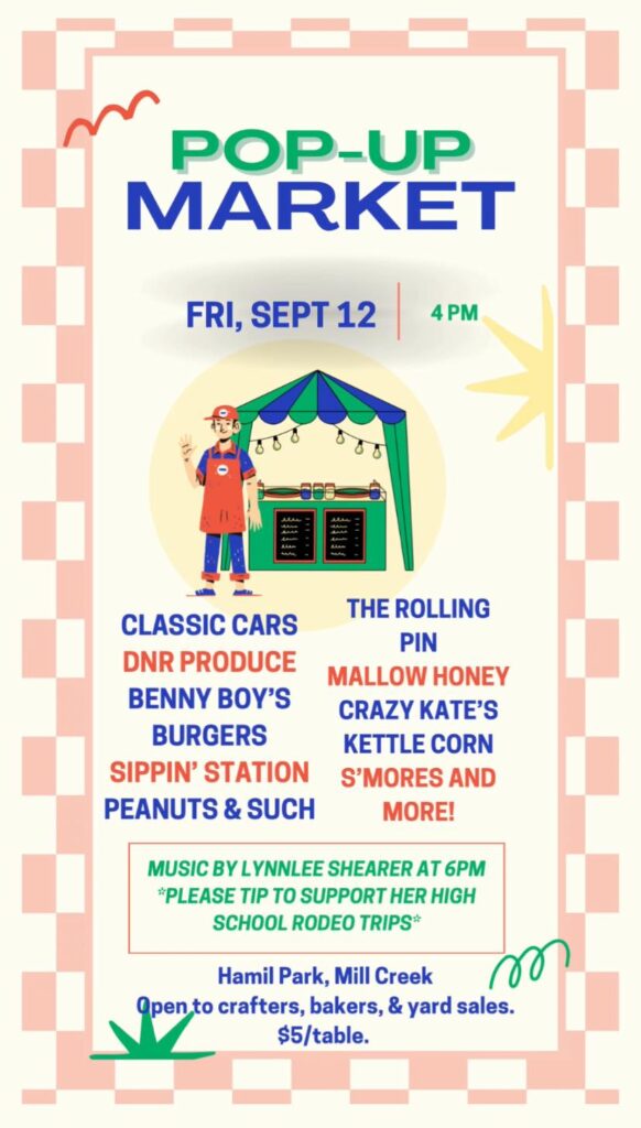 Our next pop up venue will be Friday, September 12th at Hamill Park in Mill Creek next to Liggett’s Supply. Produce/food vendors, flea market/crafts in the park earlier in the day. Music at 6:00 pm with 16 year old Lynnlee Shearer. Plans are still in the making so we’ll edit with details as we go. Come eat, buy some produce, visit the vendors, get some kettle corn, and listen to Lynnlee sing at 6:00 pm. We’ll keep the coffee pot going, maybe even some hot chocolate/drinks and treats and finish the evening socializing and singing around the campfire with some good old fashioned hymns and campfire songs! Bring your guitar or whatever instrument you play and join us.