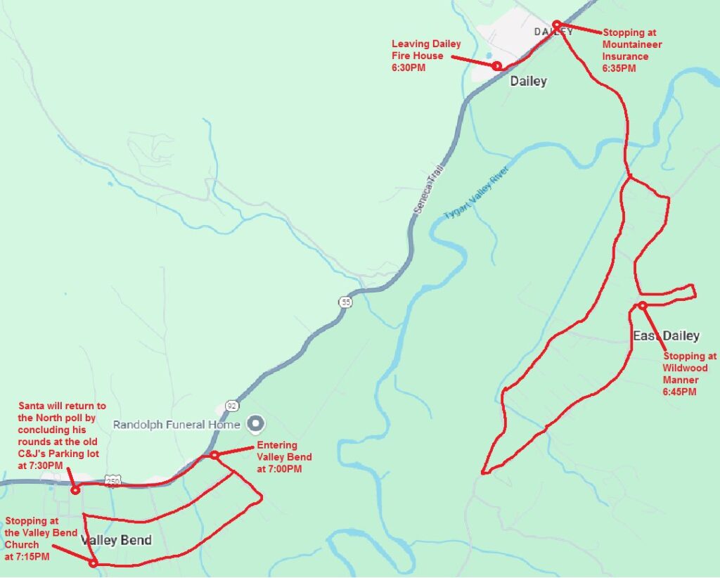Santa will be making pit stops at the communities of Dailey, East Dailey and Valley Bend!