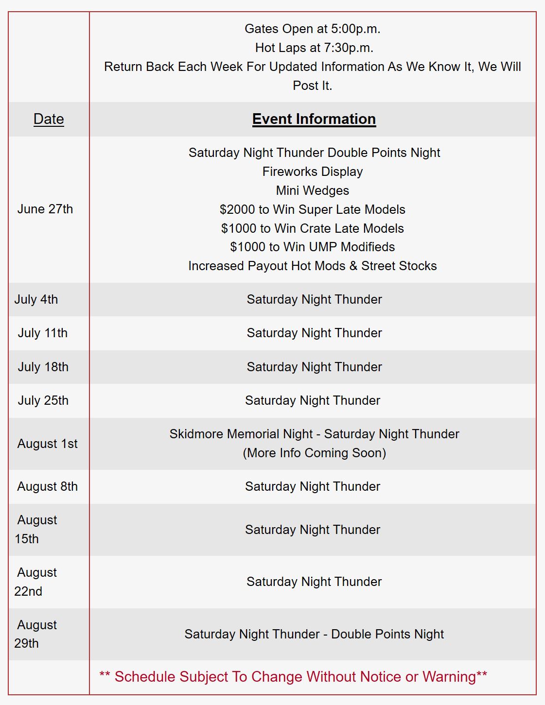 General: $15, Children UNDER 12: FREE when accompanied by paying adult. Pits $30. Hot laps 7:30