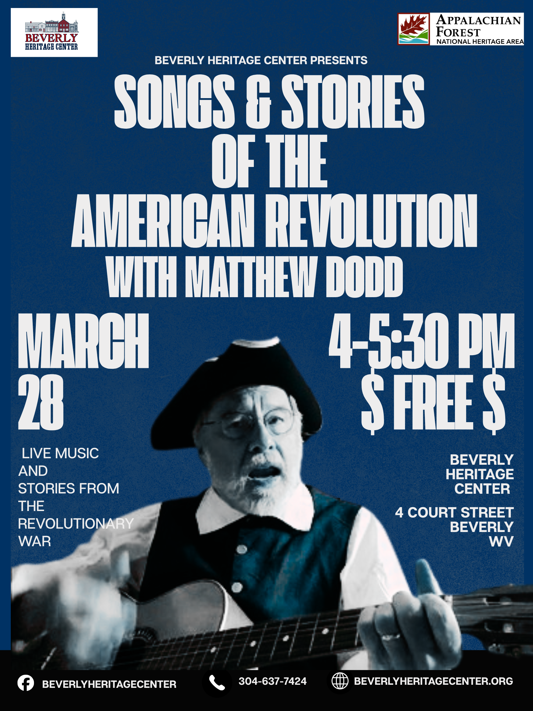 Celebrate America’s 250th with us! We’ll host Matthew Dodd’s unique performance of Songs and Stories of the American Revolution – live at the BHC for one day only. Dressed in Colonial clothes, Matthew takes audiences back in time to the days of the American Colonial settlement and the American Revolution. Using rousing period songs and stories that put the songs into the context of the time, Matthew brings to life the exciting Days of 1776. Matthew sings and plays guitar, banjo and mandolin. This event is sure to be a treat for history lovers and live music fans alike. Saturday, March 28th.