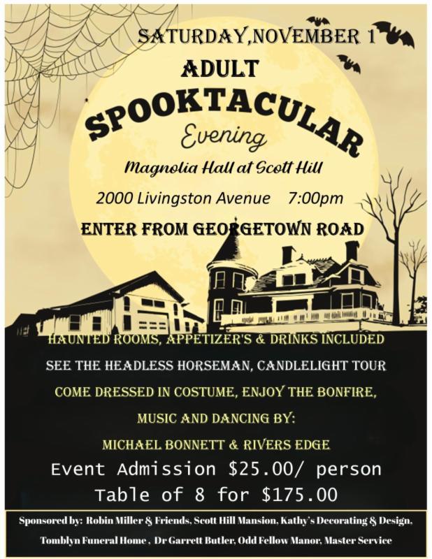 Adult Spooktacular Evening, November 1 at Scott Hill Magnolia Hall. Music, Dancing, Bonfire, Costume Judging, Candlelight Tour of The Mansion. 7:00pm, use back entrance on Georgetown Road. Appetizer and Drinks included, Music and dancing by Michael Bonnett & Rivers Edge. Appetizer’s & Drinks included. $25.00 per person or a table of 8 for $175.00. (only pay for 7 for discount, but includes space for 8 adults)