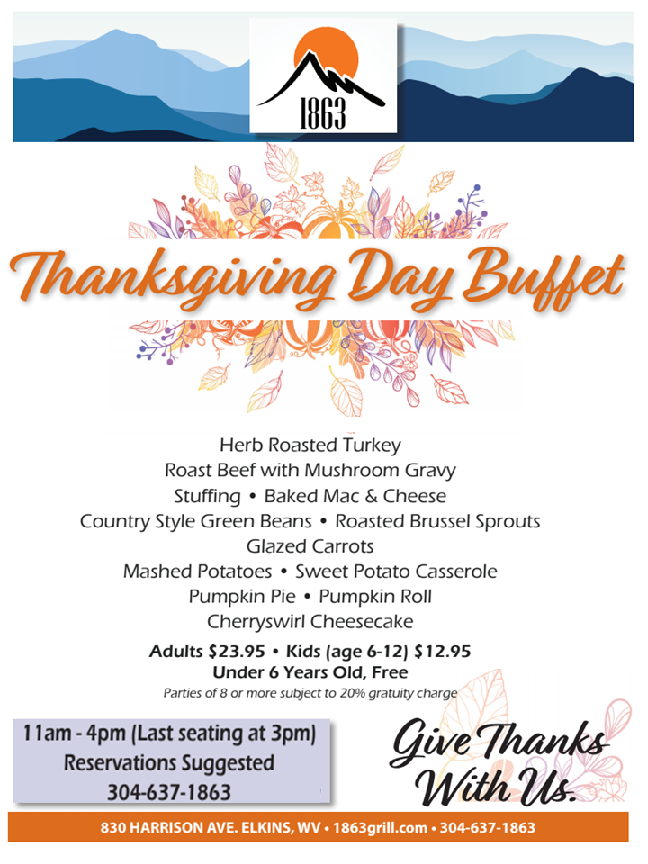 Posted by January 14, 2026 « All Events This event has passed. Thanksgiving Day Buffet @ 1863 Appalachian Bistro November 28, 2019 @ 11:00 am - 3:00 pm « Chris Fry @ El Gran Sabor Thanksgiving Feast (reservations required) @ Graceland Inn » Add to calendar Google Calendar iCalendar Outlook 365 Outlook Live Details Date: November 28, 2019 Time: 11:00 am - 3:00 pm Event Category: Food & Drink Event Tags:Food Specials, Holiday Venue 1863 Appalachian Bistro, 830 Harrison Ave, Elkins, WV 26241, USA 1499 Harrison Ave United States + Google Map Related Events Wine Down Wednesday- Graceland Inn January 14 @ 5:00 pm - 9:00 pm Kids Play, Adults Sip | Big Timber Brewing January 15 @ 5:00 pm - 8:00 pm Chess Night | Fox Hops Brewery January 15 @ 7:00 pm - 9:00 pm|Recurring Event (See all)An event every week that begins at 7:00 pm on Thursday, repeating until January 15, 2026