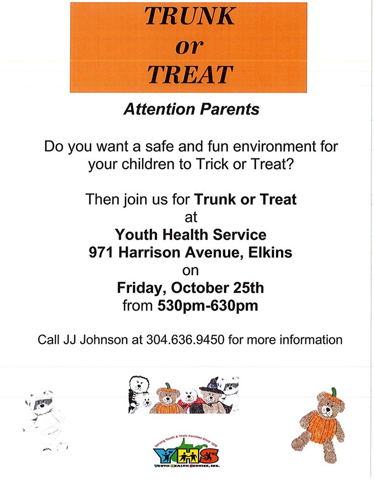 Posted by January 16, 2026 « All Events This event has passed. Trunk or Treat @ Youth Health Service October 25, 2019 @ 5:30 pm - 6:30 pm « Elkins Main Street Downtown Trick or Treat Gandy Dancer: Premier Show » Free and safe event held at the main parking lot at Youth Health Service. Add to calendar Google Calendar iCalendar Outlook 365 Outlook Live Details Date: October 25, 2019 Time: 5:30 pm - 6:30 pm Event Category: Community Event Tags:Children activities, Community, Halloween Website: https://www.facebook.com/events/387909095451090/ Venue Youth Health Services, Inc. 971 Harrison Avenue Elkins, WV 26241 United States + Google Map Phone 304-636-9450 Related Events Apertures of Appalachia: A Community Photo Exhibit | Darden Mill January 17 @ 9:30 am - 4:00 pm Music Trivia | Fox Hops Brewery January 17 @ 7:00 pm - 9:00 pm Edge to Edge | Elkins Sewing Center January 19 @ 10:00 am - 1:00 pm