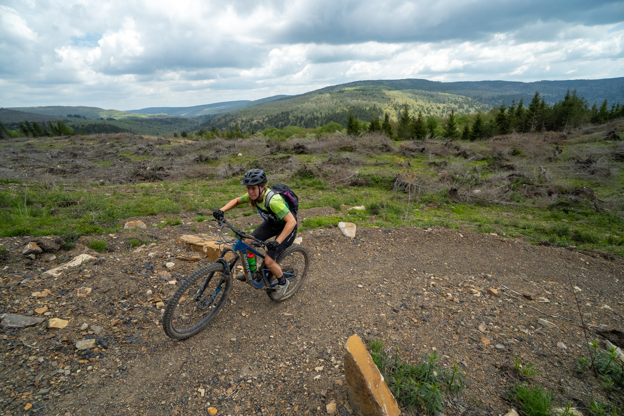 Now onto the Junco Trail which is 2 miles. It is our preference to ride the Warbler Loop Trail to connect with the Junco Trail. In our opinion, this way seems to be the better ride, but you can also start this trail on the road and the start of it is a steady, long thrilling downhill run. Either way you ride it, you’re bound to see some wildlife and truly experience the variant landscape. If you go our way, you’ll have both tricky uphill climbs and fast downhill runs. In the beginning you’ll go through spruce tree stands and in between large rock formations. The trail itself is hardpacked dirt and gravel. On your ride, you’ll also see scattered vernal ponds that have been created by the USFS, which help control sediment and provide habitat for amphibians. In some portions, you’ll almost feel as though you are in a different world due to the bare, rocky scenery from old strip-mining techniques and current prescribed burns.