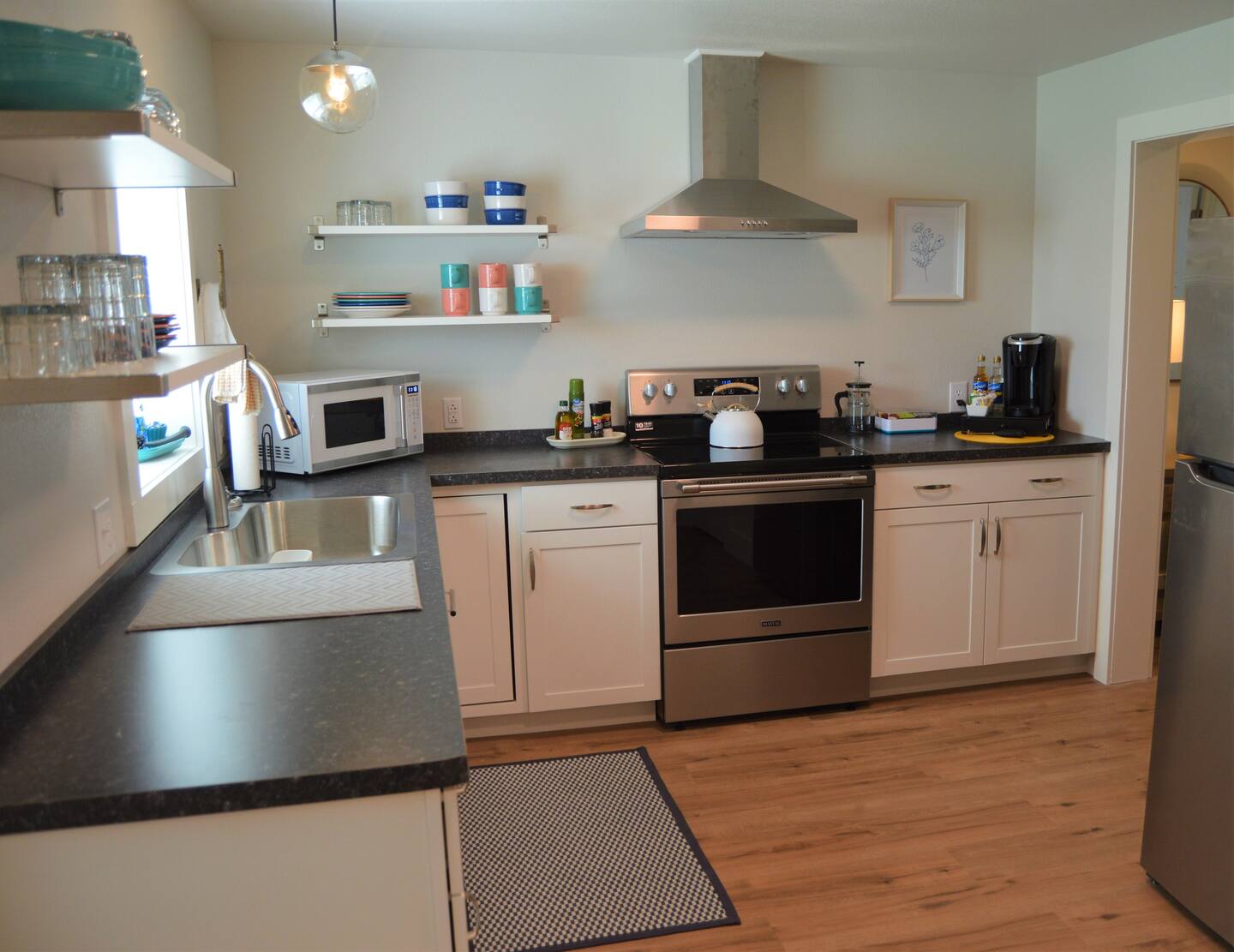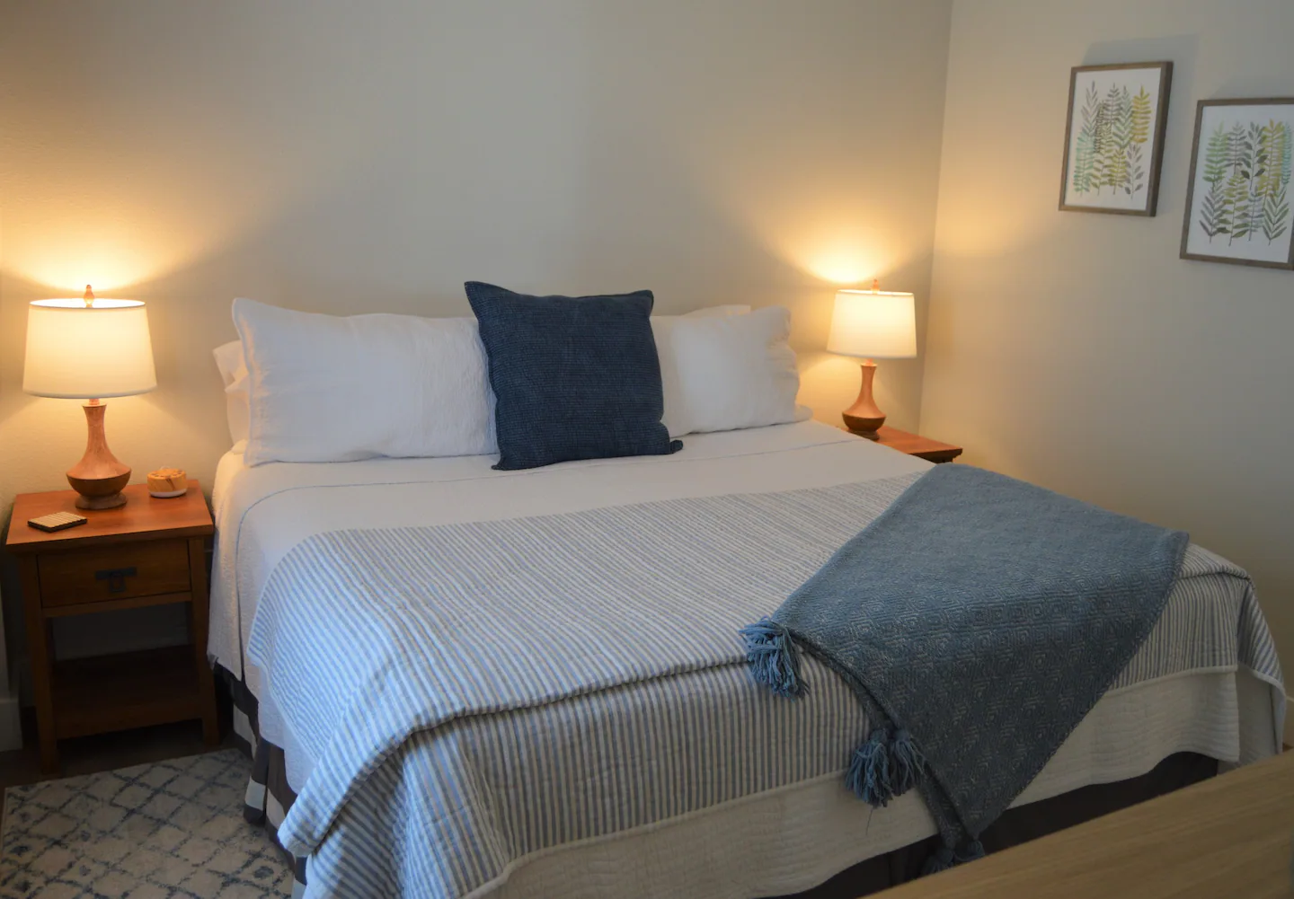This first floor unit has entry access from the front and the back of the property. The large kitchen is just off of the living room that also includes a small eating area for guests. Both bedrooms include generous closets with hangers, a luggage stand and a chest of drawers for additional storage. You will also find that each bedroom includes full-length mirrors, white noise machines and ceiling fans for your comfort. All bedrooms windows are furnished with blinds and blackout curtains for your privacy.