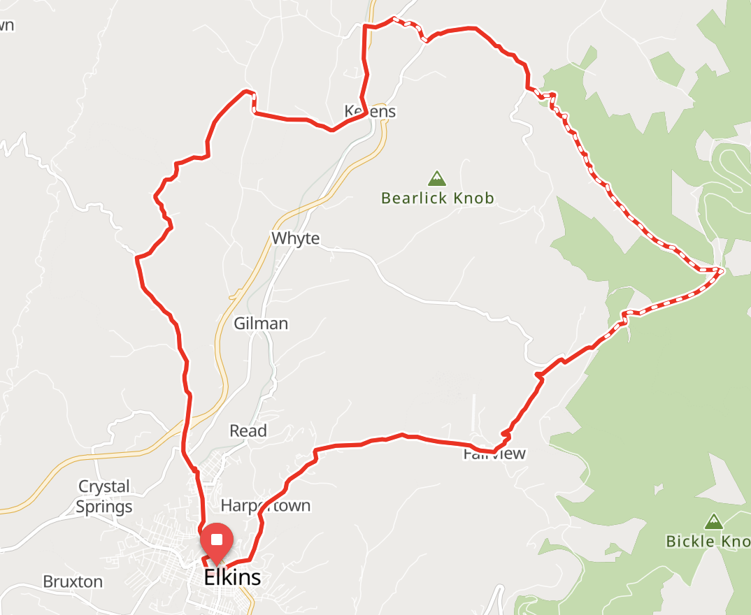 From there, a steep descent takes you towards Kerens. At this point, this route takes you on some nice rolling roads back to Elkins. But you can also choose to take the rail trail back to town.