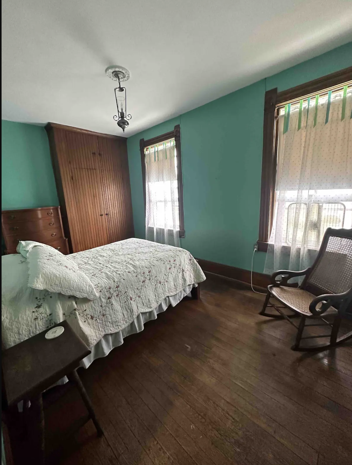 Guests will be greeted by the expansive covered front porch providing a perfect place to enjoy an early morning cup of coffee or gather as a group. The first floor of this historic home boasts various sitting rooms where guests may enjoy the home’s craftsmanship and rich history. The first floor includes the kitchen, dining space, sun porch, and bathroom. The kitchen is ready for use, featuring pots, pans, utensils, drinking glasses, and dishware. The home also offers three large furnished bedrooms all located on the second floor and accessed only by stairs.