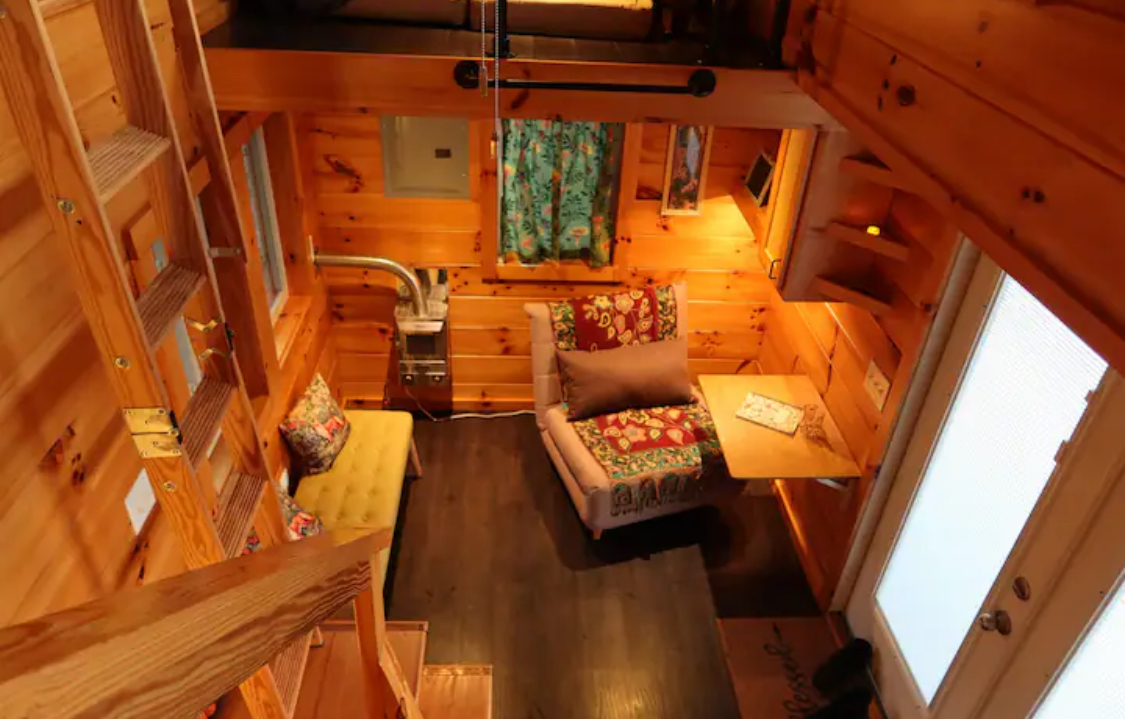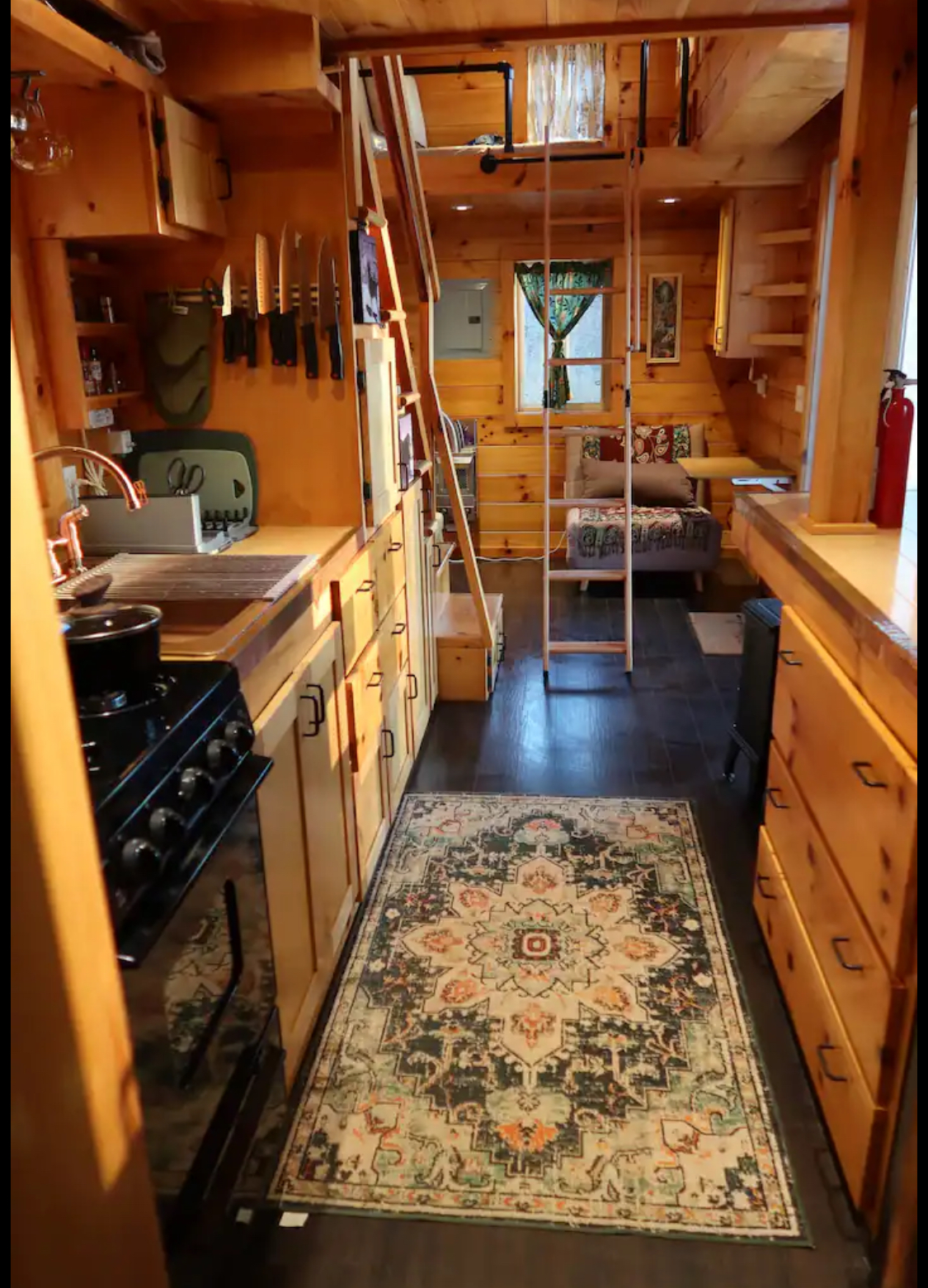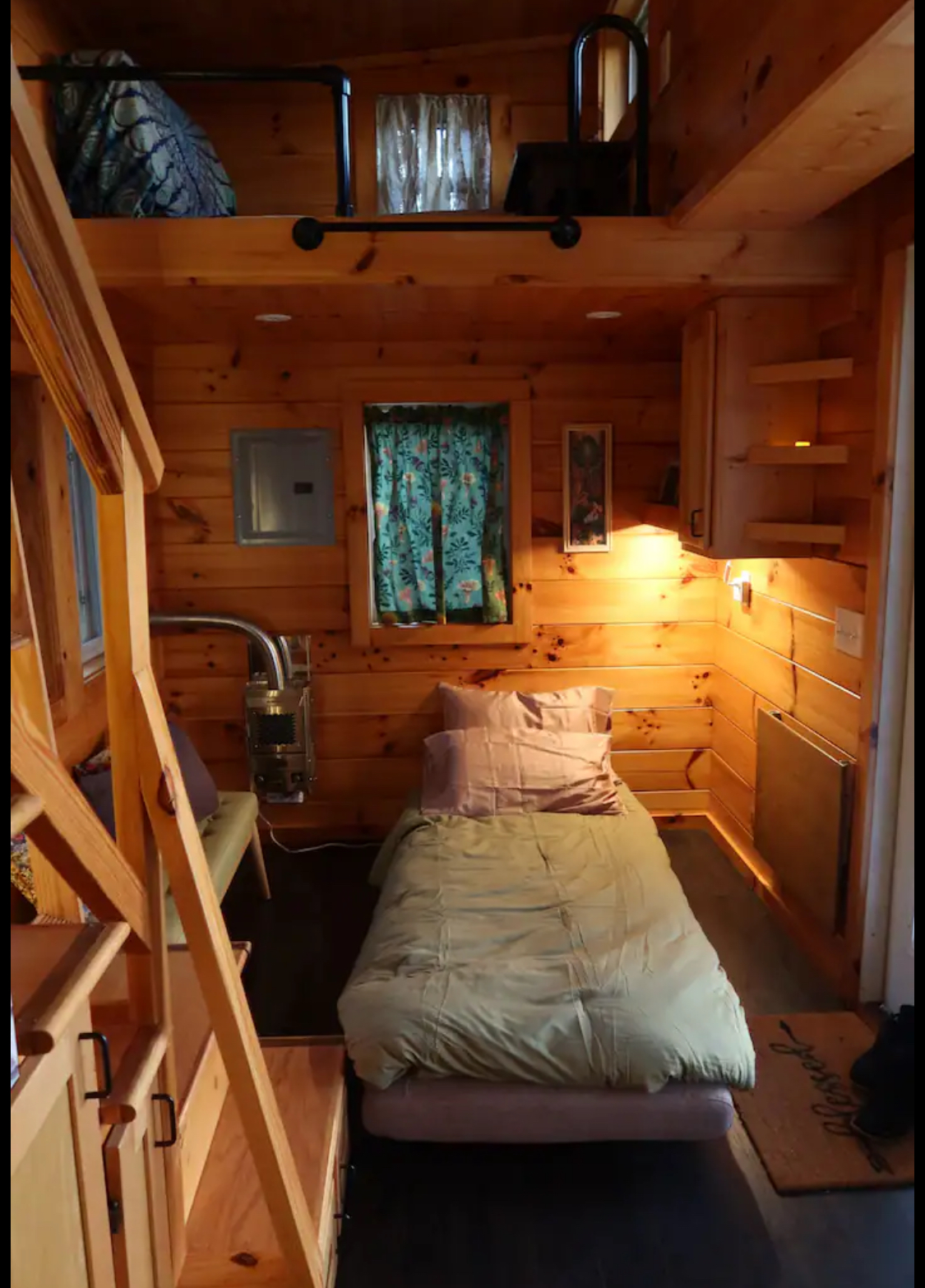 You have a full kitchen with a four burner propane stove and oven, small fridge, air fryer/toaster oven, full sink, French press, tea kettle, cookware, utensils, oils and spices. Rest comfortably in a queen bed in a sunny loft that you can sit up in (no standing). We provide hypoallergenic bedding and organic cotton linens. There is a full shower, sink, and composting toilet. Hot water is on-demand. There is a living room with a convertible chair that turns into a twin-sized bed suitable for a older child/young adult. There is also a sitting bench and fold-down table. You also have a smaller loft that’s accessible from a ladder that is usable as a reading nook or extra storage space. Heat is provided by infrared space heaters and propane Dickinson marine heater. There is a ceiling fan. We supply a crystal infrared healing mat with tourmaline and topaz for aches and pains. This space, even though it’s private, is uphill 450 feet from a four-lane. You can’t see it from the tiny house, except for in the winter at the edge of the drive, but you can hear it at times. Yes, there are stairs to climb. There is no TV.