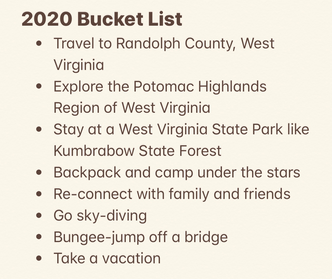 again and the travel ban is lifted, creating a bucket list for the rest of 2020 is a great way to be prepared for your next adventure and ready to roll. Have a plan on what you want to accomplish and where you’d like to travel to. We suggest day-trips or weekend getaways for the first few months. We might be biased but if you live within a 5 hour drive of Randolph County, West Virginia we highly suggest us to be a destination on your bucket list. Not only do we have an ample amount of outdoor recreation available at your fingertips, we also have plenty of events, festivals, and train rides where you can experience our culture like none other. This is a great way to have your friends or family to write down what they would like to do and incorporate it all into your future plans!