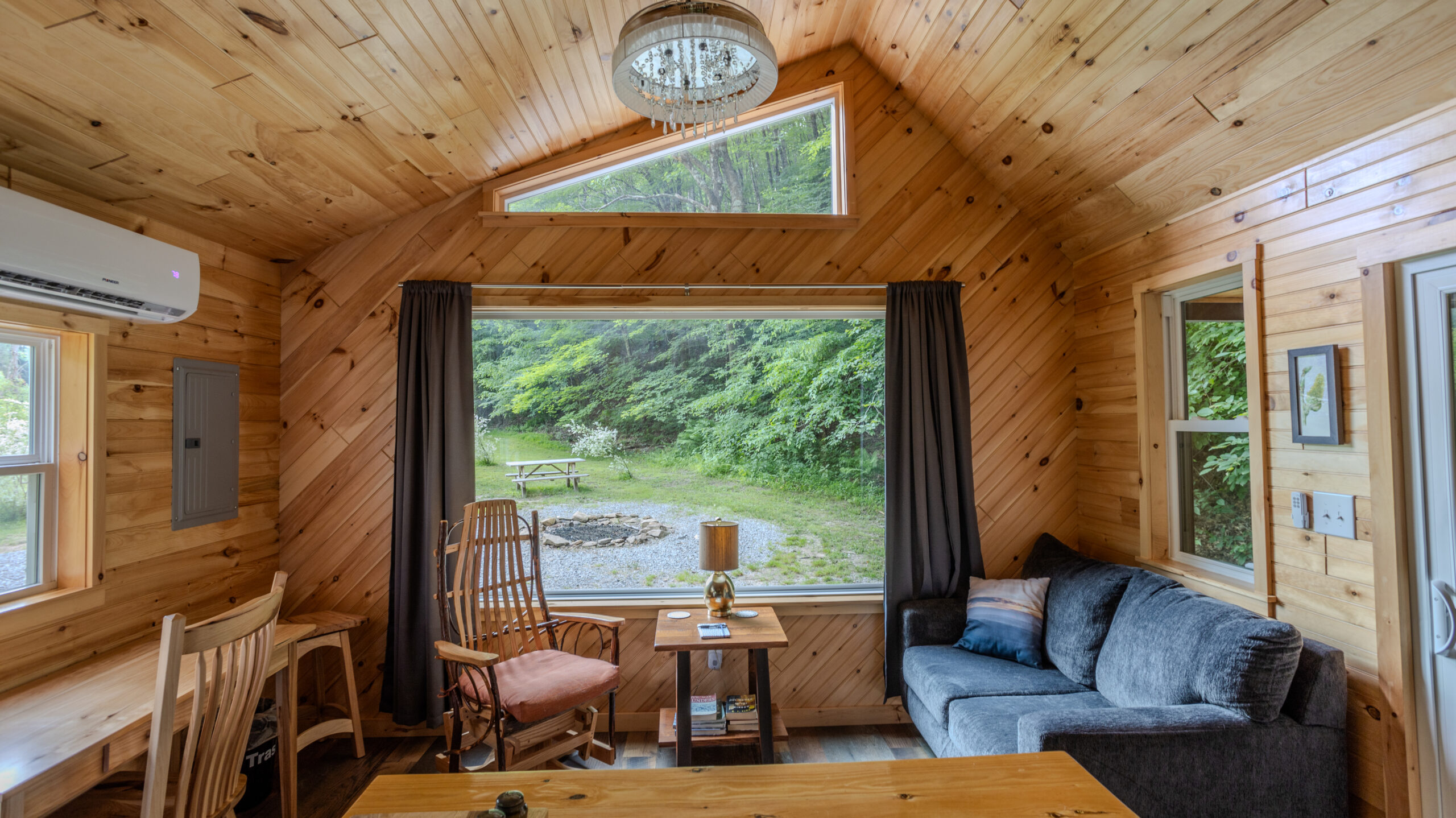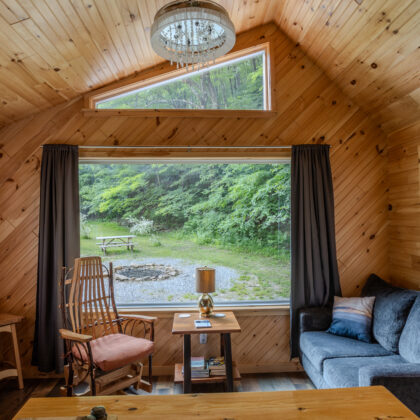 Max: Groups can book a few cabins together — close enough to gather easily, but spaced out enough for privacy when needed. Most cabins have a queen bed, some also have a loft bed, and many feature big windows that look out over the forest and hills.