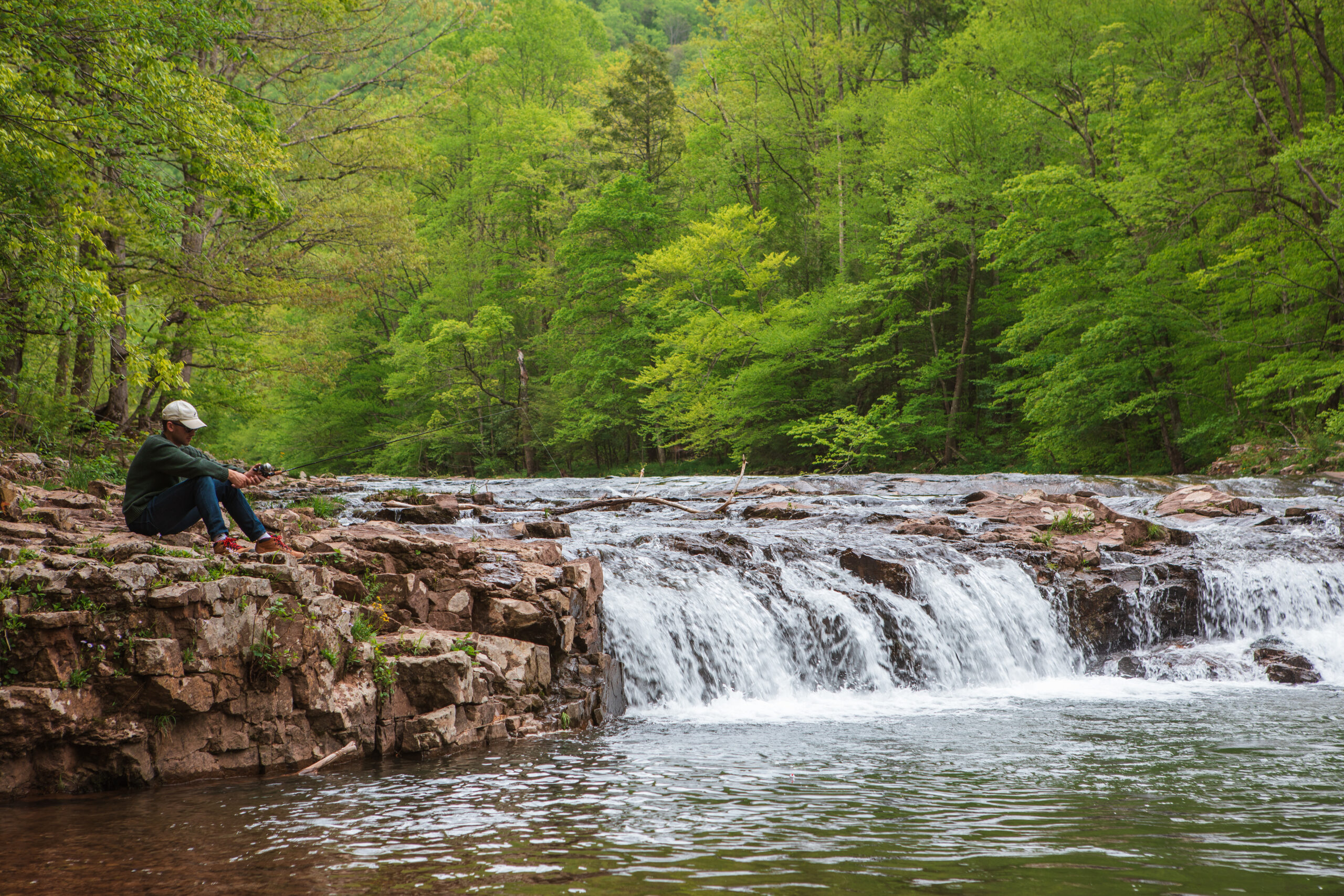 The hike to High Falls begins at the High Falls Trailhead. You’ll start by crossing a footbridge and ascending Shavers Mountain through a switchback trail. The trail takes you through a large open field, where you will glimpse the West Fork Rail Trail before continuing into the woods. About halfway down the trail, you’ll start to hear the sound of the roaring river below. It’s about 2.5 miles to go up and over the mountain.