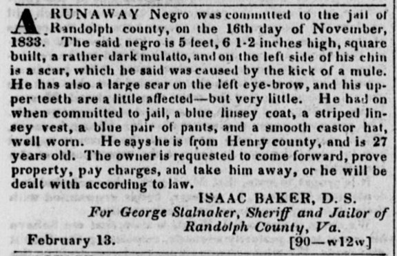 One of the better-known mentions of freedom-seekers in Beverly is a case from 1833, where an unnamed man from Henry County, Virginia, was captured and imprisoned in the 1813 Randolph County Jail. Though he is not mentioned by name there is a full physical description of him, including his height, complexion, and the presence of scars. He would have most likely traveled along the section of the Staunton-Parkersburg Turnpike between Beverly and Huttonsville – either on his own, or on his way to imprisonment.